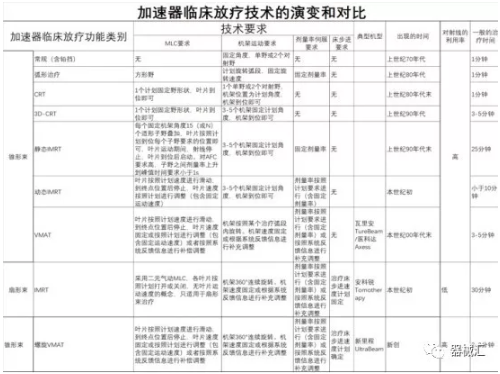 下表主要是關(guān)于錐形束加速器臨床技術(shù)的發(fā)展演變情況。