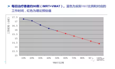 需要說明的是,有些技術(shù)本身并不是為了加快治療速度而發(fā)展起來的,例如,大分割放療技術(shù),其發(fā)展的本質(zhì)是基于其生物效應(yīng)優(yōu)勢。但是我們不能否認(rèn),該技術(shù)的發(fā)展確實(shí)減少了定擺位的累計(jì)次數(shù)和時間,等于是減少了整個的治療時間,有利于在同樣多的時間里可以治療更多的患者。同樣,多采用VMAT技術(shù),和普通IMRT相比,也能減少工作時間。如下圖所示: