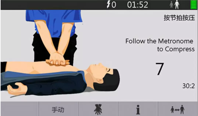 1. 開啟AED,打開AED的蓋子,依據(jù)視覺和聲音的提示操作(有些型號(hào)需要先按下電源)。2. 給患者貼電極,在患者胸部適當(dāng)?shù)奈恢蒙?,緊密地貼上電極(通常而言,兩塊電極板分別貼在右胸上部和左胸左乳頭外側(cè),具體位置可以參考AED機(jī)殼上的圖樣和電極板上的圖片說明)。3. 將電極板插頭插入AED主機(jī)插孔。4. 開始分析心律,在必要時(shí)除顫,按下“分析”鍵(有些型號(hào)在插入電極板后會(huì)發(fā)出語音提示,并自動(dòng)開始分析心率,在此過程中請(qǐng)不要接觸患者,即使是輕微的觸動(dòng)都有可能影響AED的分析),AED將會(huì)開始分析心率。分析完畢后,AED將會(huì)發(fā)出是否進(jìn)行除顫的建議,當(dāng)有除顫指征時(shí),不要與患者接觸,同時(shí)告訴附近的其他任何人遠(yuǎn)離患者,由操作者按下“放電”鍵除顫。5. 一次除顫后未恢復(fù)有效灌注心律,進(jìn)行5個(gè)周期CPR(心肺復(fù)蘇術(shù))。除顫結(jié)束后,AED會(huì)再次分析心律,如未恢復(fù)有效灌注心律,操作者應(yīng)進(jìn)行5個(gè)周期CPR,然后再次分析心律,除顫,CPR,反復(fù)至急救人員到來。