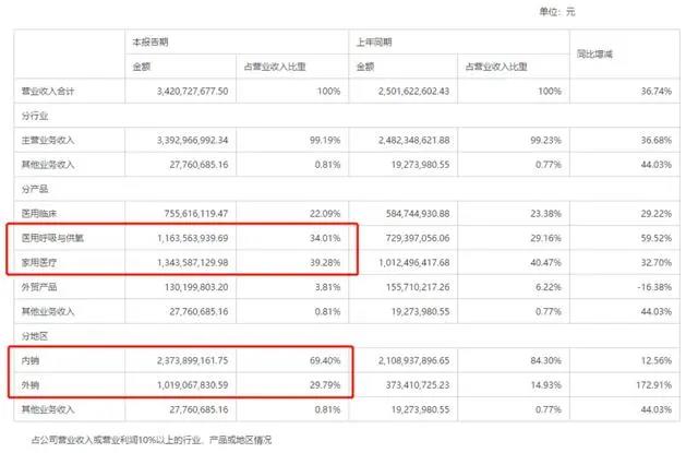 根據(jù)半年報,公司產(chǎn)品主要集中在醫(yī)用呼吸與供氧、家用醫(yī)療等領(lǐng)域,這兩項產(chǎn)品占比超過7成,且業(yè)務(wù)主要在境內(nèi)進(jìn)行。所以真正能夠決定公司未來常態(tài)化業(yè)績表現(xiàn)的,不是外貿(mào)產(chǎn)品,也不是海外訂單。