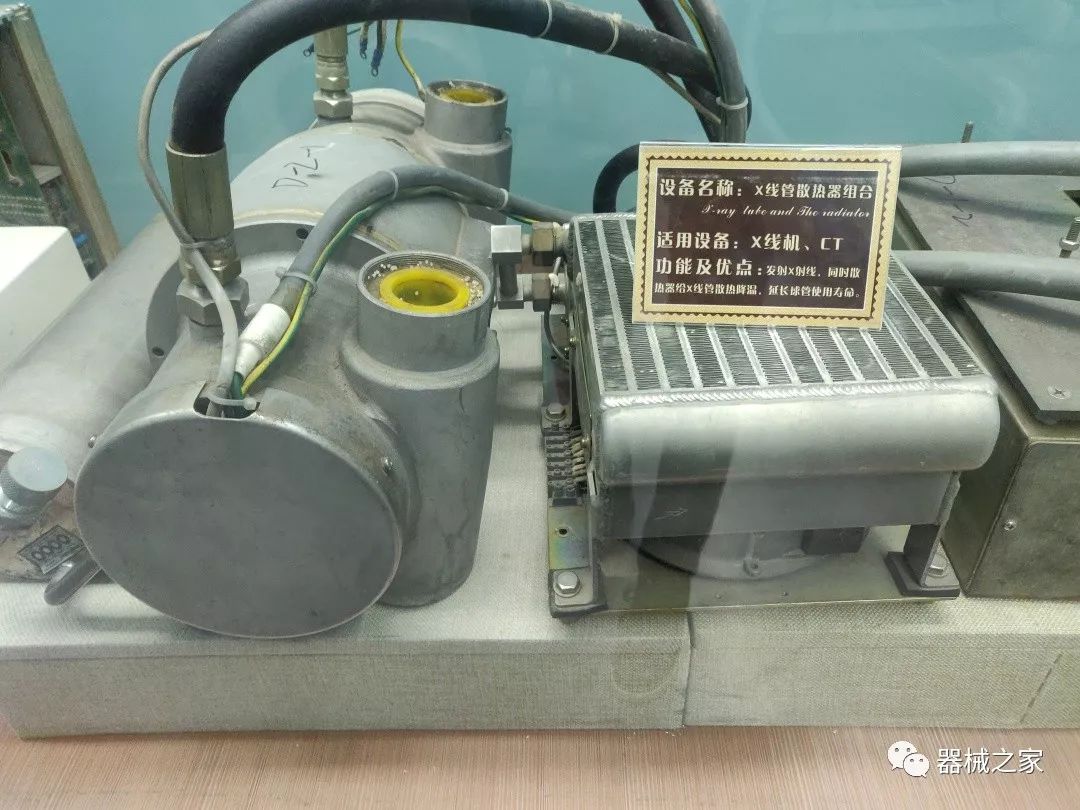 由于X線機產(chǎn)生X射線的過程中只有百分之一的動能轉(zhuǎn)化為X射線,其余的能量都以熱能的形式散失。這就需要良好的散熱設(shè)備,也就是這個散熱器。散熱器大多采用油冷。變壓器油不僅絕緣,而且能夠吸收散亂射線,防止擊穿。使用時,一般會用油泵將冷油泵入到球管周圍,將熱油從另一管導(dǎo)出,在冷卻板上冷卻,循環(huán)利用。