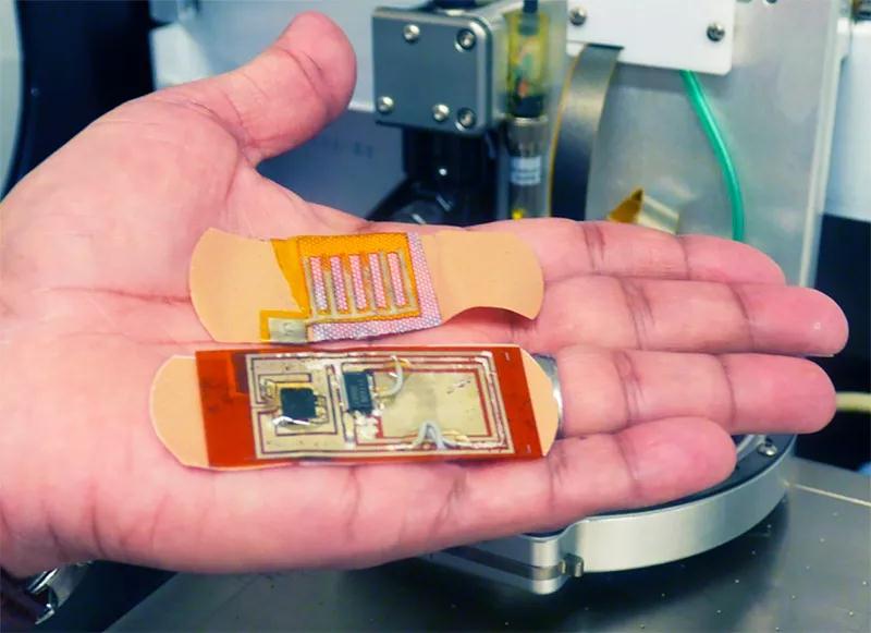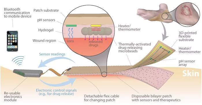 這種類型也是智能繃帶,它能通過電子元件記錄潰瘍形成、感染、氧氣、壓力、溫度、濕度、血糖水平來評估傷口的愈合進度,幫助醫(yī)生及時做出決定。
