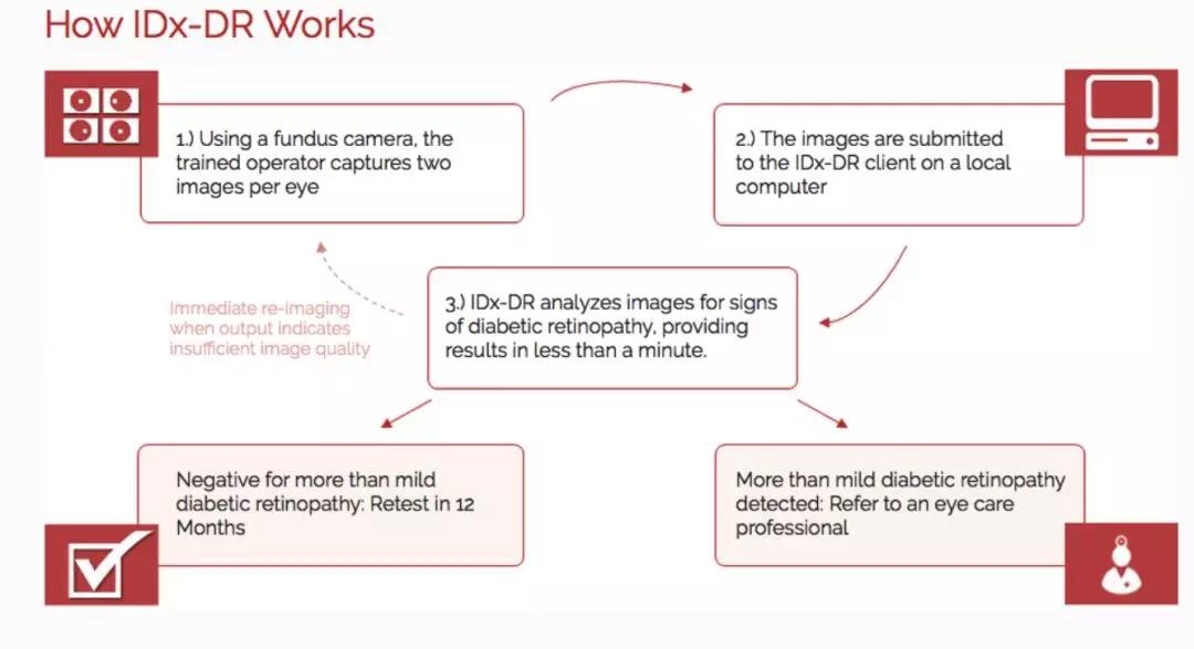 與預(yù)約真人醫(yī)生相比,IDx-DR 真的是太方便簡單了,只需要護(hù)士或者醫(yī)生通過使用特殊的視網(wǎng)膜照相機(jī)拍下患者的視網(wǎng)膜照片,隨后按照 IDx-DR 軟件的指示上傳圖像,并確定圖像的質(zhì)量是否足夠獲得分析結(jié)果。如果圖像合格,軟件將自動(dòng)分析(無須專業(yè)醫(yī)生參與)患者是否患有糖尿病性視網(wǎng)膜病變,并將根據(jù)結(jié)果診斷并決策后續(xù)治療。