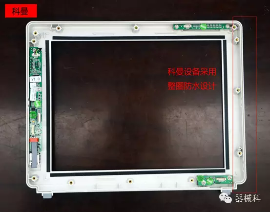 防水是所有電子類產品的一個重要功能。如果防水功能設計不好,儀器很容易受潮,從而引起使用不便,嚴重的將會報廢。科曼前后殼之間采用硅膠密封線整圈的防水設計,做工更麻煩,耗材多,但更安全;邁瑞前后殼之間采用硅膠密封線頂部的局部防水設計,省時省料,但存在安全隱患。