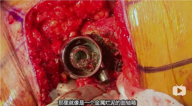 Tower 立刻進行了髖關(guān)節(jié)重置,在重置手術(shù)的過程中,當(dāng)醫(yī)生取出原來的那塊假體時,發(fā)現(xiàn)那里就像是一個金屬爛泥的曲軸箱,關(guān)鍵的韌帶——髖關(guān)節(jié)囊已經(jīng)溶解了。