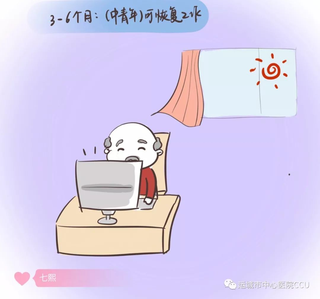 出院后3--6個月:中青年可恢復(fù)工作,應(yīng)注意勞逸結(jié)合。