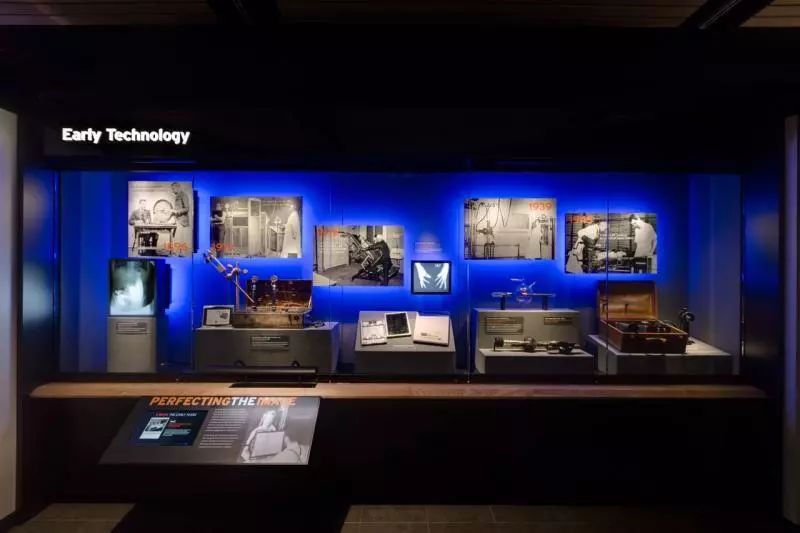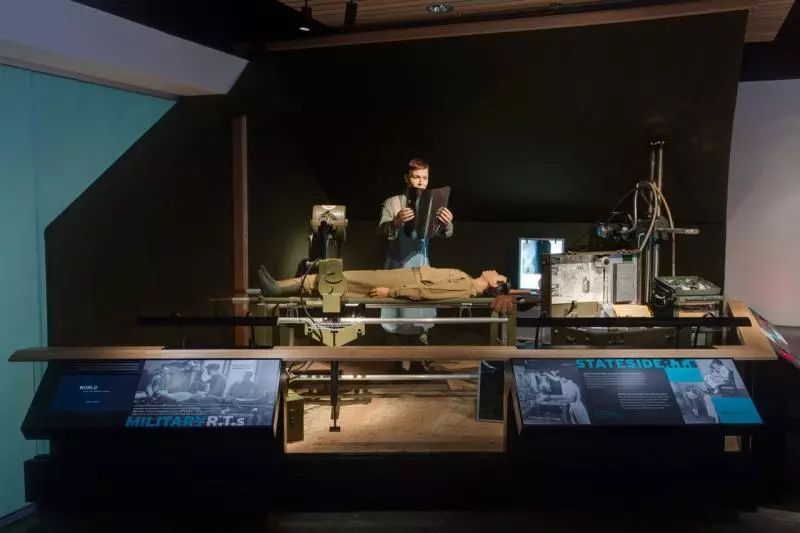 除了交互式組件外,還展出了許多老式設備,包括Picker透視裝置,1935 GE便攜式“手提箱模型”X射線裝置和第二次世界大戰(zhàn)的軍用X射線裝置。展出了300多件文物。