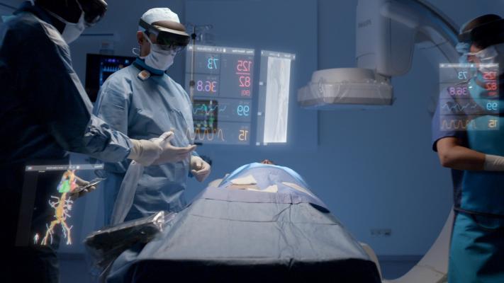 在微創(chuàng)手術(shù)過(guò)程中,醫(yī)生不能直接看到和觸摸治療區(qū)域,而是依靠先進(jìn)的醫(yī)學(xué)成像技術(shù),如超低劑量X射線成像和超聲波,以及其他導(dǎo)航技術(shù),觀察患者身體內(nèi)部并引導(dǎo)專用器械的行動(dòng)。飛利浦和微軟為HoloLens 2開(kāi)發(fā)的增強(qiáng)現(xiàn)實(shí)概念(augmented reality concept),將目前顯示在大型2D屏幕上的重要數(shù)據(jù)的實(shí)時(shí)成像和其他來(lái)源,轉(zhuǎn)化為一種3D全息增強(qiáng)現(xiàn)實(shí)環(huán)境,這種環(huán)境可以被醫(yī)生以人體工程學(xué)的方式輕松直觀地控制。
