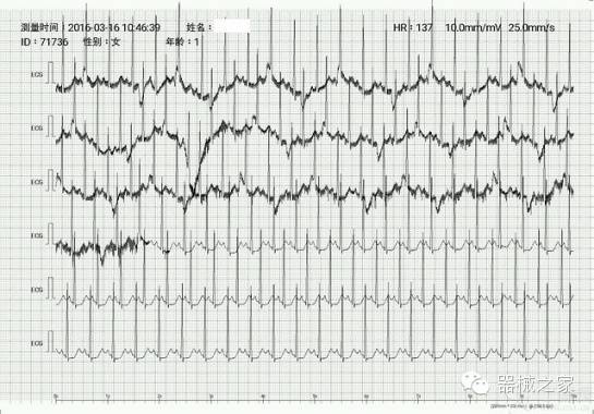 3、關(guān)于抗干擾能力,對于只有兩個電極沒有地線的情況下,對這個機器的要求真的不能太高。基線干擾和不穩(wěn)定是經(jīng)常的,所以需要測試人配合安靜勿動。測試1描測的心電圖除了只有一個導聯(lián)的限制之外,基本可以滿足各項心電圖數(shù)據(jù)的測量。測試2和3都是處于深度鎮(zhèn)靜氣管插管的小兒,出現(xiàn)兩個問題:1.小兒腹軟且腹部動度較大導致呼吸波干擾明顯,所以建議把左下腹電極片貼到左髂部或左股部外側(cè);2.基線干擾更加明顯,這時本人手握患兒左下肢后基線干擾消失,對心電記錄波形沒有產(chǎn)生明顯影響。